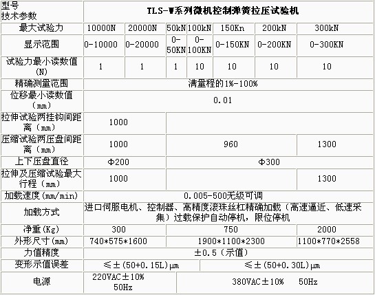 產(chǎn)品概述: TLS-WI系列微機(jī)控制拉壓彈簧試驗(yàn)機(jī)依據(jù)JB/T7796-2005《拉壓彈簧試驗(yàn)機(jī)技術(shù)條件》規(guī)定的技術(shù)要求制成。該型拉壓彈簧試驗(yàn)機(jī)主要用 于測(cè)試各種螺旋彈簧及彈性元件的強(qiáng)度,即在一定的變形量(或高度)下測(cè)試彈簧的試驗(yàn)力或在一定的試驗(yàn)力下測(cè)定彈簧的高度或變形量。 功能特點(diǎn): 本機(jī)主要適用于各種彈簧的強(qiáng)度試驗(yàn)、力學(xué)性能及工序能力分析。 本機(jī)軟件包有速度控制、參數(shù)輸入、數(shù)據(jù)處理、結(jié)果觀察、圖表顯示、圖表打印、數(shù)據(jù)保存等功能模塊組成。 試驗(yàn)方式多樣化,煙臺(tái)彈簧試驗(yàn)機(jī)價(jià)格,可以設(shè)置彈簧的試驗(yàn)力,檢測(cè)彈簧的剩余高度或變形量;也可以設(shè)置彈簧的剩余高度或變形量,彈簧拉壓試驗(yàn)機(jī),檢測(cè)試驗(yàn)力等功能。 多點(diǎn)自動(dòng)變速采集數(shù)據(jù),并自動(dòng)返回到初始位置,整個(gè)試驗(yàn)過程自動(dòng)化。 過載自動(dòng)返回,以保護(hù)傳感器不受損壞。 具有強(qiáng)大的數(shù)據(jù)處理及數(shù)據(jù)統(tǒng)計(jì)功能,繪制剛度曲線、計(jì)算彈簧的分段剛度,可以進(jìn)行數(shù)據(jù)統(tǒng)計(jì),繪制正態(tài)分布圖、計(jì)算工序能力指數(shù)。采用數(shù)控電機(jī)調(diào)速系 統(tǒng)或進(jìn)口交流伺服電機(jī)及調(diào)速器和精密滾珠絲杠副組成傳動(dòng)系統(tǒng),數(shù)顯彈簧拉壓力試驗(yàn)機(jī),與高精度負(fù)荷傳感器、位移傳感器及數(shù)字式數(shù)據(jù)采集卡、PC組成測(cè)控系統(tǒng),實(shí)現(xiàn)了穩(wěn)定可靠運(yùn)行 及精確測(cè)量。 技術(shù)參數(shù): ![]() ![]()