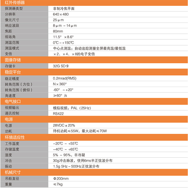 產(chǎn)品特點 體積小重量輕 直徑200mm,紅外熱成像儀價格,重量7kg,大大降低飛機有效負荷 640x480高分辨率紅外熱成像儀 分辨率高,可清晰分辨出輸電線路發(fā)熱故障點 跟蹤精度高穩(wěn)定性好 采用陀螺穩(wěn)定平臺,意大利紅外熱像儀,可有效隔離運動載體的各種振動、起伏、 顛簸,醫(yī)學紅外熱像儀,消除圖像的模糊和晃動 視頻實時回傳 高空視頻可實時回傳至地面指揮中心,紅外熱像儀成像,提高巡線效率 可拍照錄像 配置32G內(nèi)存卡,車載紅外熱像儀,可對觀測點拍照錄像,夜視紅外熱像儀,便于地面對故障進行分析 提供標準的通訊接口 標準的通訊接口,方便與無人機、直升機等載體通訊,手持式紅外熱像儀,安裝調(diào)試方便